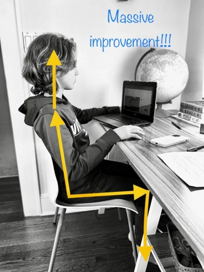 While this work from home set up is not in any way ideal, how we sit while using it can be improved in an instant.