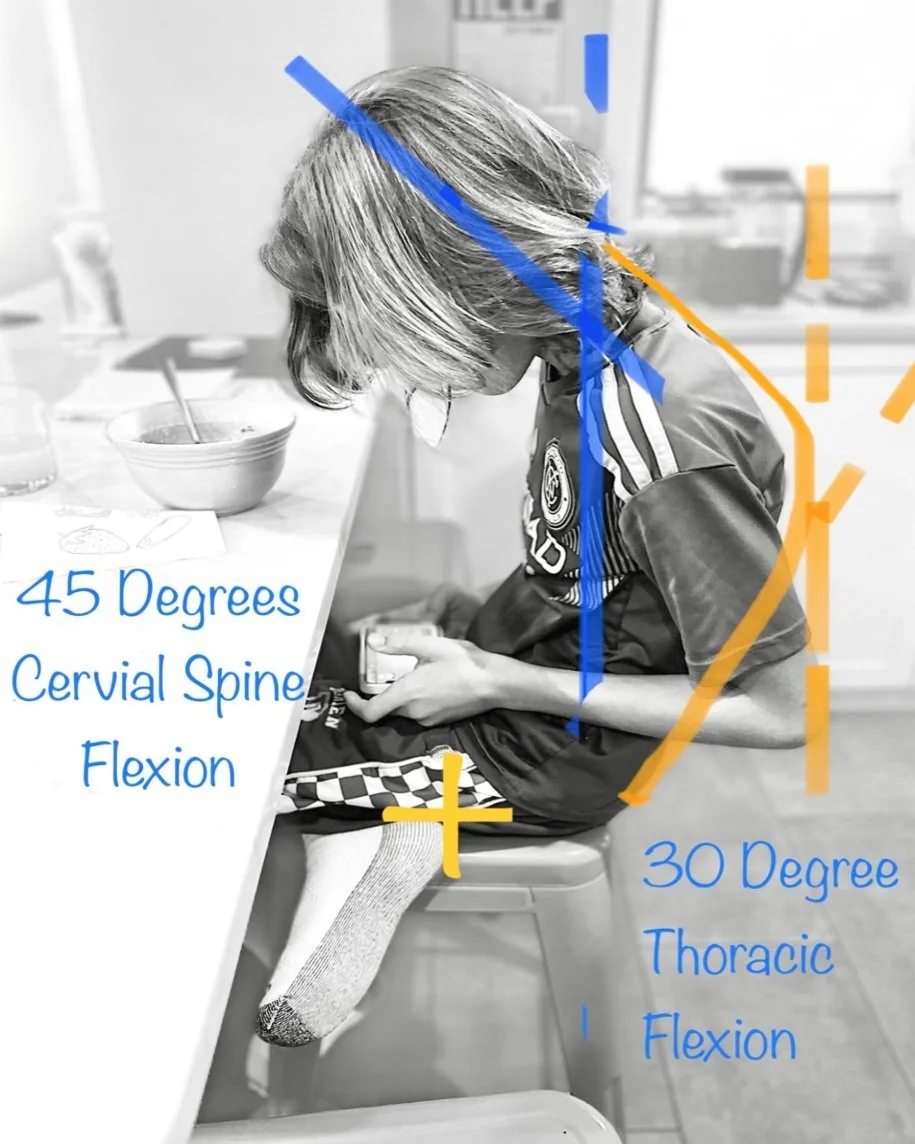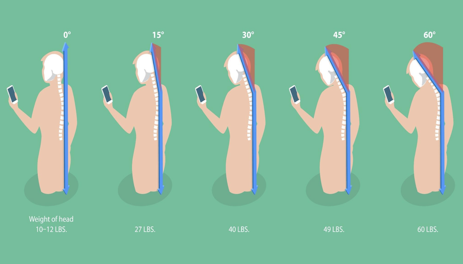 Just a few degrees of forward head posture while we look down at our phone or computer can place a huge amount of stress on the musculoskeletal system that supports the weight of our head.